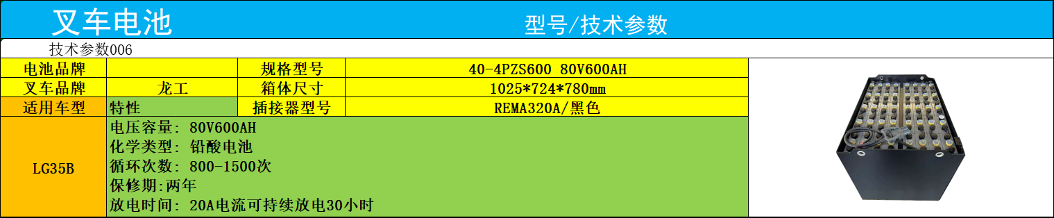 龍工叉車電瓶LG35B 迅炬40-4PZS600鉛酸電動叉車電瓶廠家直銷80V600AH龍工LG35B 3.5噸平衡重叉車的專用動力核心是型號40-4PZS600的鉛酸電動叉車電瓶,這款80V600AH的動力單元鐵箱尺寸*控制在1025×724×780mm,能*嵌入叉車動力艙,是眾多叉車電瓶廠家爭相適配的標(biāo)桿型號。作為龍工叉車的原廠認證鉛酸電動叉車電瓶,40-4PZS600不僅適配性強,更以穩(wěn)