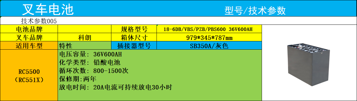 科朗叉車RC5500系列叉車電瓶18-6VBS600 迅炬叉車RC551X電瓶安裝參數(shù)36V600AH