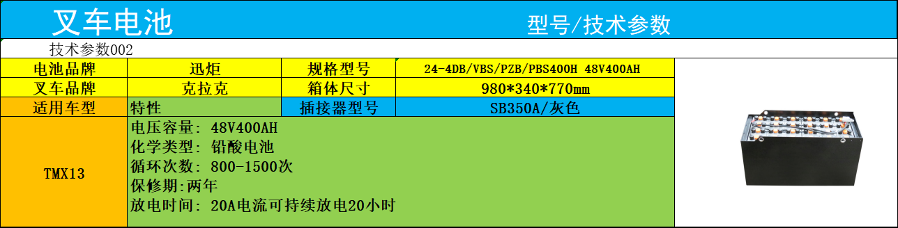 迅炬關(guān)聯(lián)克拉克TMX12叉車電瓶(24-4VBS400H 48V400AH)參數(shù)及應(yīng)用簡介