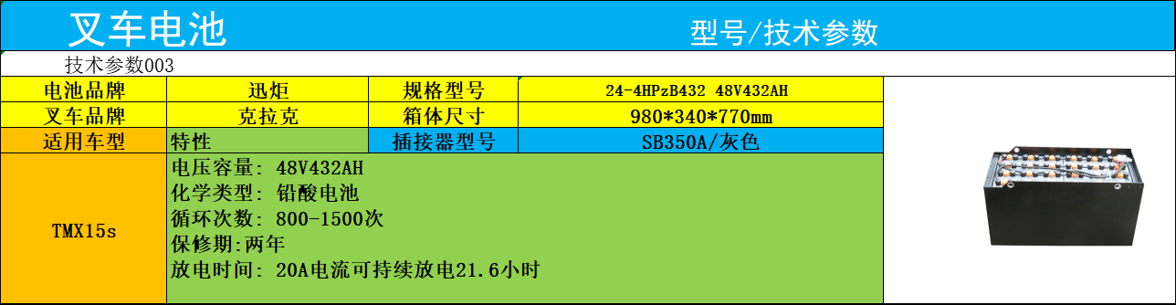 迅炬關(guān)聯(lián)克拉克TMX15S叉車電瓶(24-4HPZB432 48V432AH)參數(shù)及應(yīng)用簡介